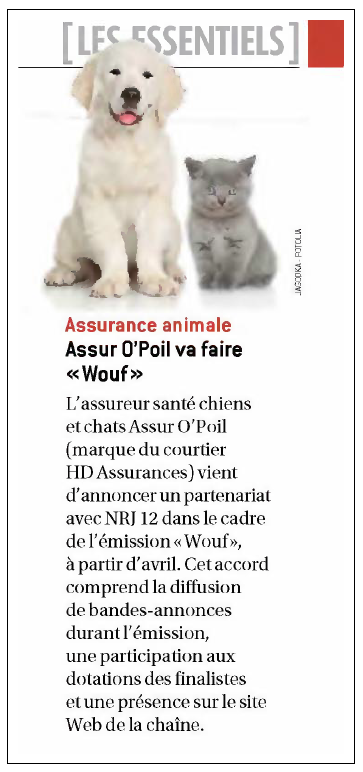 L’assureur santé chiens et chats Assur O’Poil (marque du courtier HD Assurances) vient d’annoncer un partenariat avec NRJ12 dans le cadre de l’émission « Wouf », à partir d’avril. Cet accord comprend la diffusion de bandes-annonces durant l’émission, une participation aux dotations des finalistes et une présence sur le site Web de la chaîne.