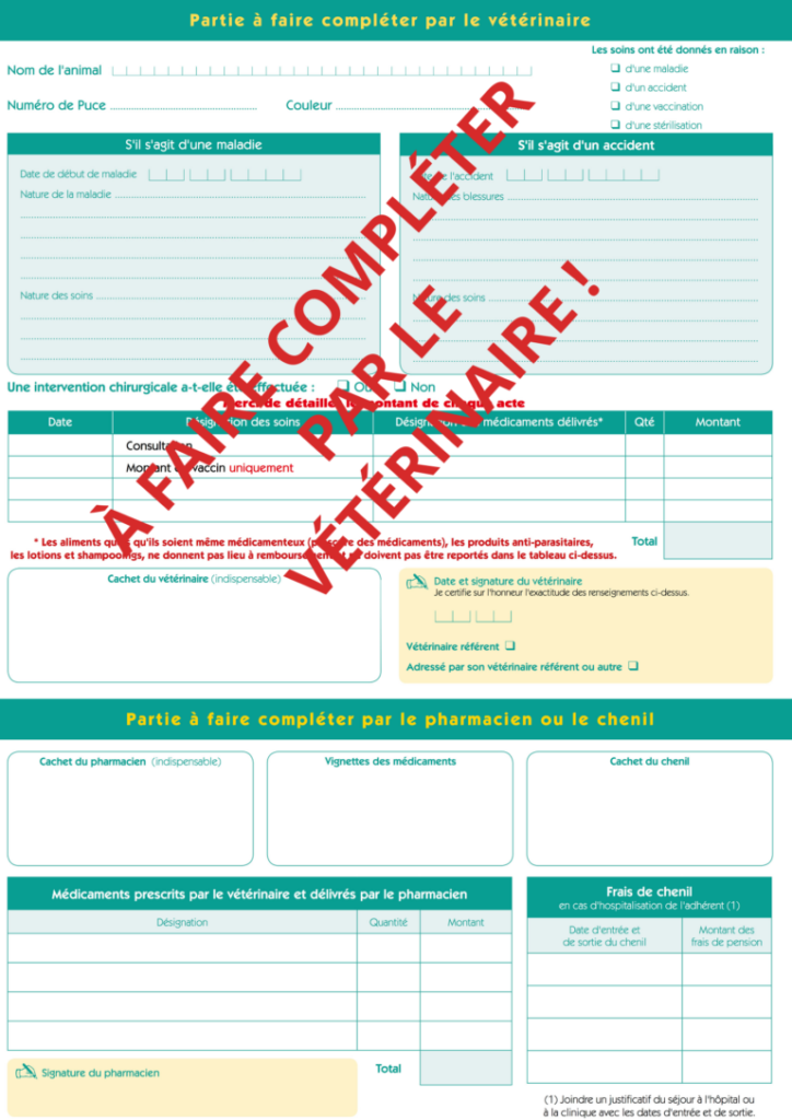 Il est indispensable de faire remplir le verso de la feuille de soins de l’assurance animaux par un vétérinaire avec qui l’animal de compagnie a eu une consultation. Faute de quoi le remboursement ne pourra pas être pris en charge. Pour éviter d’avoir à repasser au cabinet, il est plus judicieux de venir directement de la feuille de soins lors du rendez-vous vétérinaire. Il ne faut pas oublier de bien vérifier que le professionnel de santé animale qu’il ne manque rien et que toutes les informations soient bonnes.