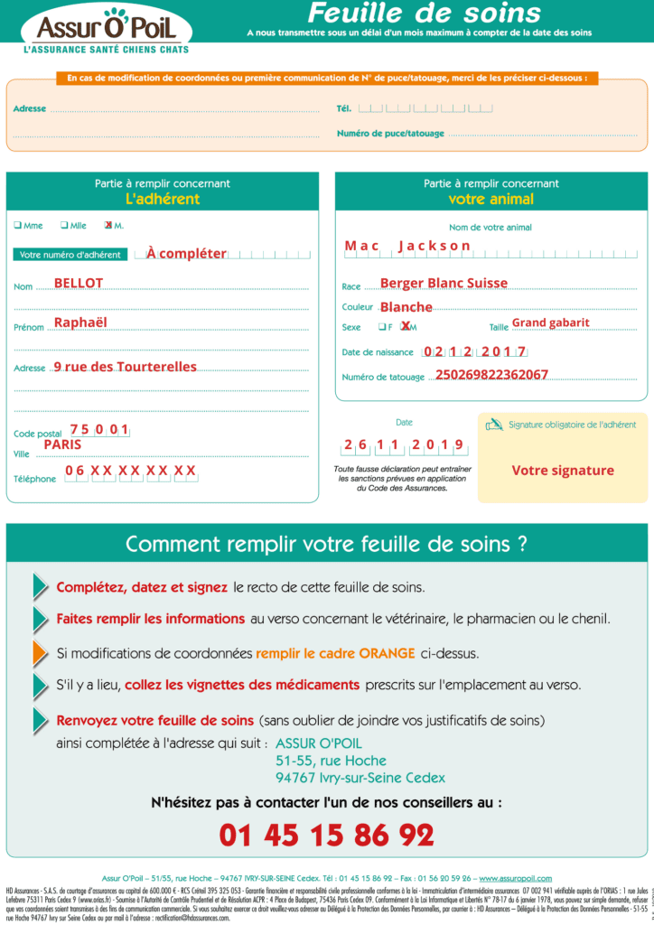 En cas de doute sur la façon de remplir la feuille de soins ou si le maître à des informations à communiquer, le service client se tient à son entière disposition.